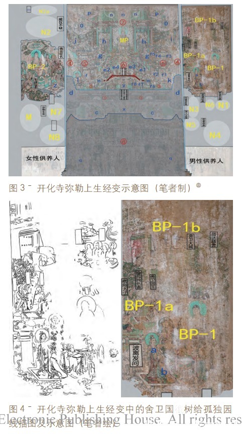 再者,人物与建筑的空间位置关系是确定人物身份的另一证据。以往我们可能有一种错误的倾向,认为五百亿天子与牢度跋提是同时出现的,他们共同以愿力化现出庄严妙丽的宫殿。然而,窥基在《经赞》中明确指出:“初,五百亿天子造外众宝宫。次一大神造法堂内院。后五大神于此二宫种种严饰”_,可知牢度大神与众天子化现宫殿的时间与建筑性质皆不相同。《弥勒上生经》中尚无“内院”“外院”的概念+,但仔细比较文本可知,众天子宝冠所化为“五百万亿宝宫”,牢度跋提则是“摩尼光回旋空中,化为四十九重微妙宝宫(名为‘善法堂')”。从画面表现来看,持旃檀摩尼宝冠化现外院建筑的天子应与牢度跋提处在不同的两个建筑空间里。至于三处经变画宝冠天子中间的人物x,既然“五大神于此二宫种种严饰”,证明五大神内外院皆可停留,因此推定为五大神之一也并无不可。